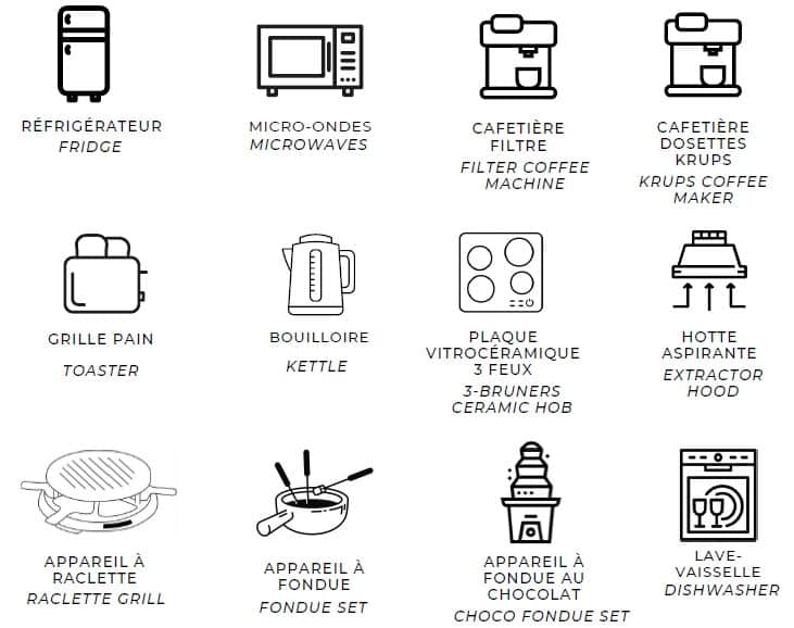 Télévision, lave-vaisselle, équipements pour bébé (lit parapluie, matelas, plan incliné, réhausseur de chaise, réducteur de toilette), mini machine à laver, ... : voyagez léger et profitez pleinement de vos vacances.